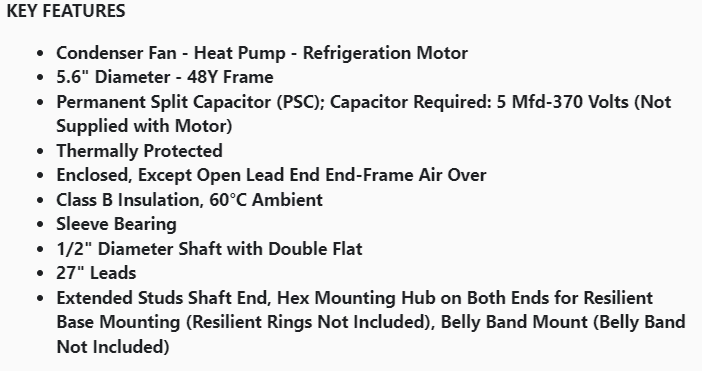 - Permanent Split Capacitor (PSC); Capacitor Required: 5 Mfd-370 Volts (Not Supplied with Motor)