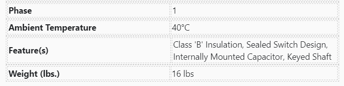 Feature(s) Class 'B' Insulation, Sealed Switch Design, Internally Mounted Capacitor, Keyed Shaft