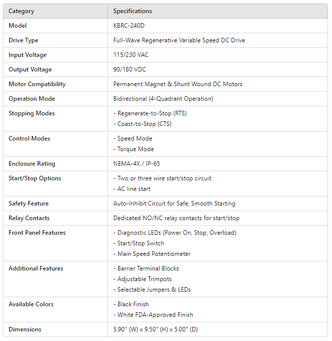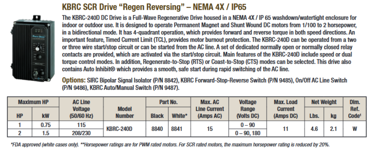 8841, (KBRC-240D) SCR DC Drive 1Hp-2Hp 115/230VAC Input 90/180VDC Output NEMA 4X Enclosure REGEN REVERSING - White