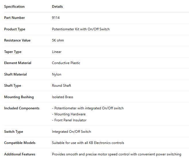 9114, All controls 5K potentiometer kit, 9111 with On / Off switch