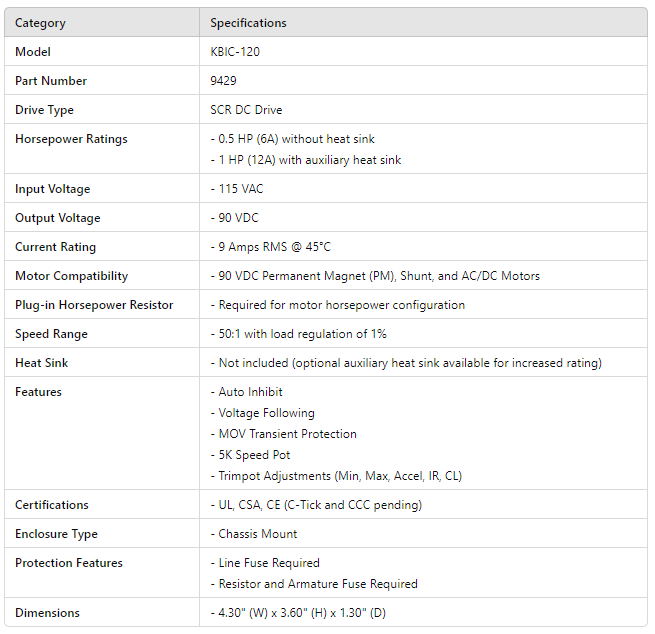 9429, (KBIC-120) SCR DC Drive 1Hp 12A With Heat Sink 0.5Hp 6A Without Heat Sink 115VAC 1PH Input 90VDC Output Chassis is backordered and will ship as soon as it is back in stock.
