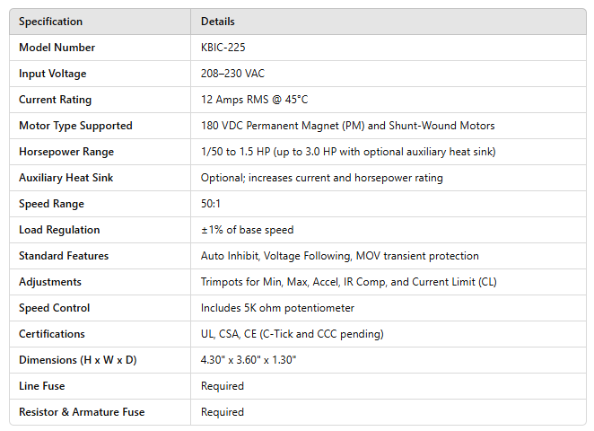 9432, (KBIC-225) SCR DC Drive 3Hp 16A With Heat Sink 1.5Hp 8A Without Heat Sink 230VAC 1PH Input 180VDC Output Chassis