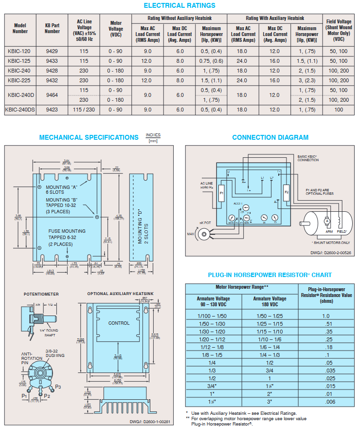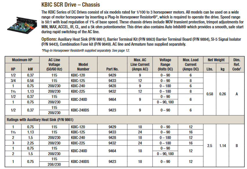 The KBIC Series of DC Drives consist of six models rated for 1/100 to 3 horsepower motors. All models can be used on a wide