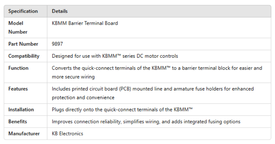 Function Converts the quick-connect terminals of the KBMM™ to a barrier terminal block for easier and more secure wiring