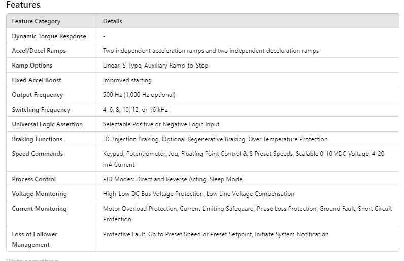 Braking Functions | DC Injection Braking, Optional Regenerative Braking, Over Temperature Protection |