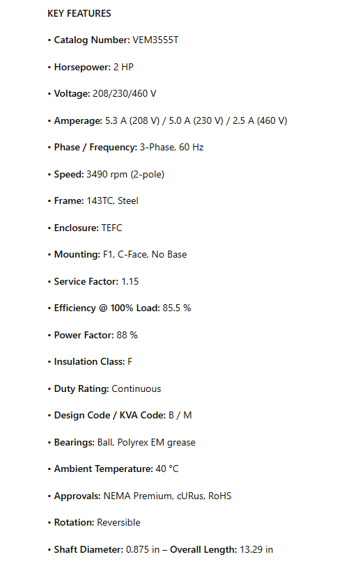 VEM3555T, 2Hp, 3490 RPM, 208-230/460V, 3Ph, 60Hz, Frame 143TC, TEFC, 3526M, F1 is backordered and will ship as soon as it is back in stock.
