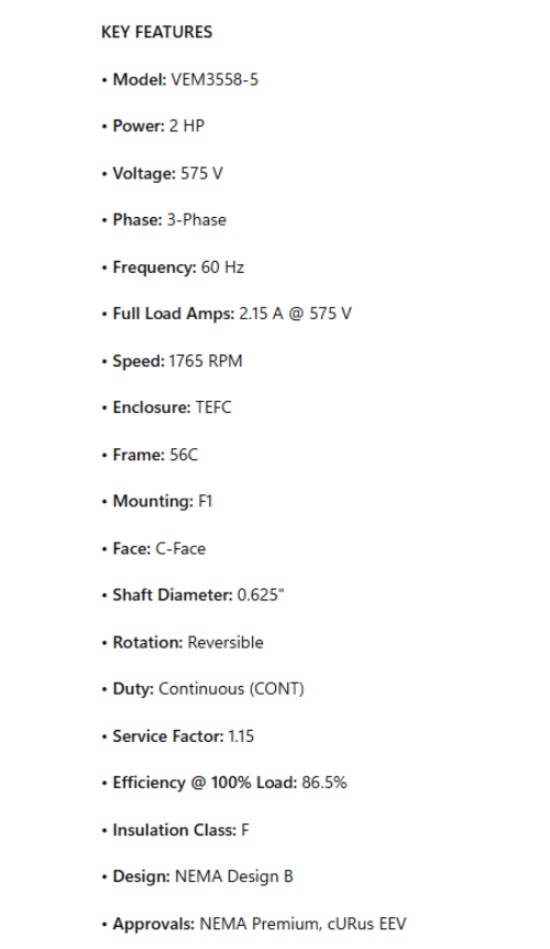 VEM3558-5, 2Hp, 1764 RPM, 575V, 3Ph, 60Hz, Frame 56C, TEFC, F1, 35A013G113G1 is backordered and will ship as soon as it is back in stock.