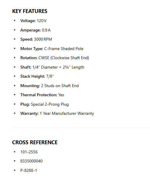 99-08-0146A, OEM Replacement , 120V, 3000 RPM, CWSE, C-FRAME is backordered and will ship as soon as it is back in stock.