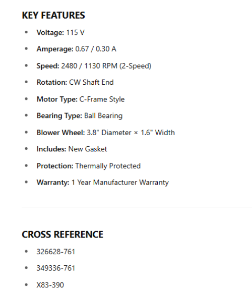 P326628-761, OEM Replacement , 115V, 2480/1130 RPM, C-FRAME, CWSE is backordered and will ship as soon as it is back in stock.