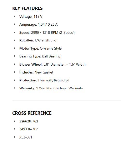 P326628-762, OEM Replacement , 115V, 2990/1318 RPM, C-FRAME, CWSE is backordered and will ship as soon as it is back in stock.