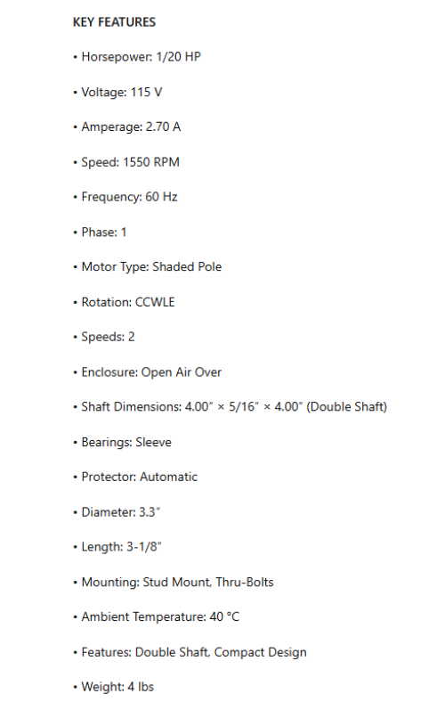 • Motor Type: Shaded Pole
