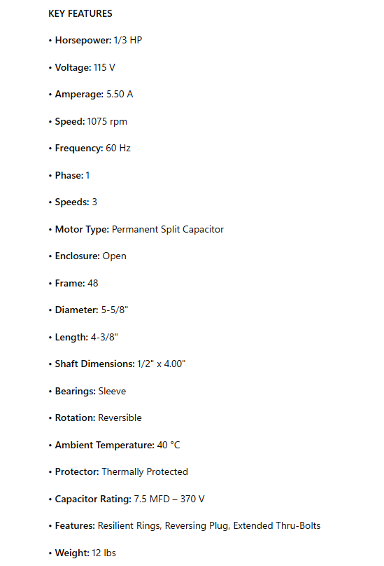 • Horsepower: 1/3 HP