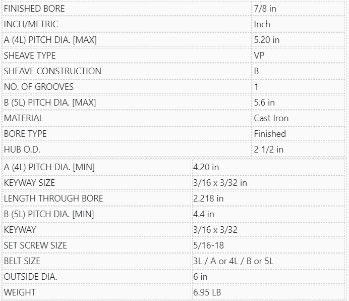 1VP60X7/8,Masterdrive, Dia 6.00'', Bore 7/8', Variable Pitch Adjustable,1 Groove,