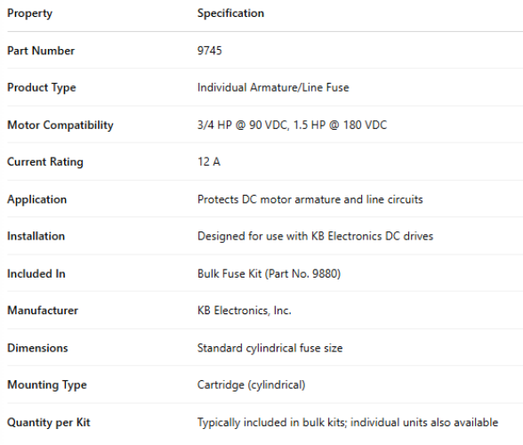 9745, INDIVIDUAL FUSE 3/4HP 90VDC ~ 1.5HP 180VDC 12A (BULK KIT P/N 9880) is backordered and will ship as soon as it is back in stock.