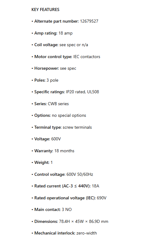 CWB18-11-30D45, EC Contactor, 18 Amp (18A), 1NO/1NC Auxiliary Contacts, 3NO, 600VAC, 50/60Hz, Screw Terminal, UL508 is backordered and will ship as soon as it is back in stock.