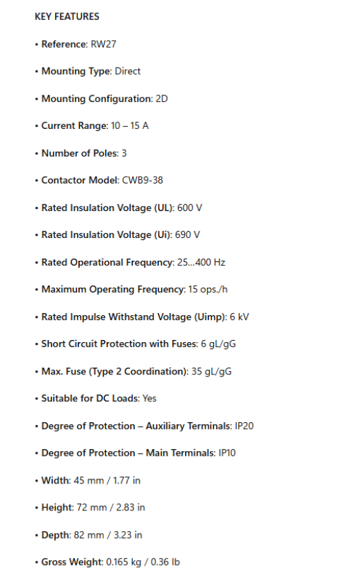 RW27-2D3-U015, Overload Relay, 3/p, 10-15A, FOR CWB CONTACTOR is backordered and will ship as soon as it is back in stock.