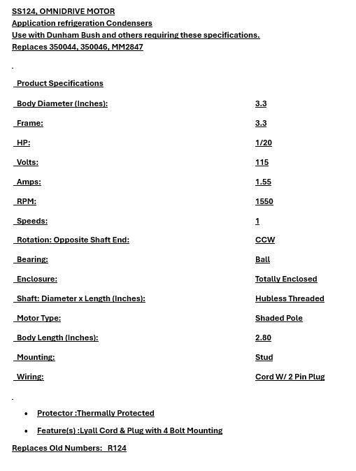 SS124, MOTOR 1/20HP, CONDENSER FAN, TOTALLY ENCLOSED, HUBLESS 3.3" DIA., 1550 RPM, 115V, OMNIDRIVE MOTOR, DUNHAM BUSH is backordered and will ship as soon as it is back in stock.
