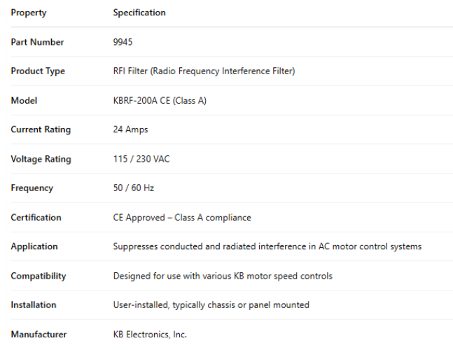 9945, All controls KBRF-200A CE (class A) approved RFI filter, 24 amps, 115 / 230VAC, 50 / 60 Hz is backordered and will ship as soon as it is back in stock.