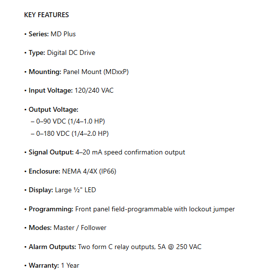 MD50P-420, Micro Drive 1/4-1.0Hp 120vac 0-90vdc, 1/4-2.0Hp 240V 0-180vdc, 4-20ma Speed Confirmation Output is backordered and will ship as soon as it is back in stock.
