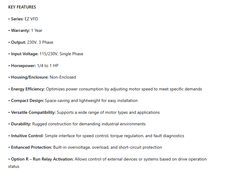 VF100C-R, EZ-VFD, 1/4 To 1Hp, 115-230Vac (1PH) I/P , 230vac (3PH) O/P ,Open Chassis with Run Relay Activation