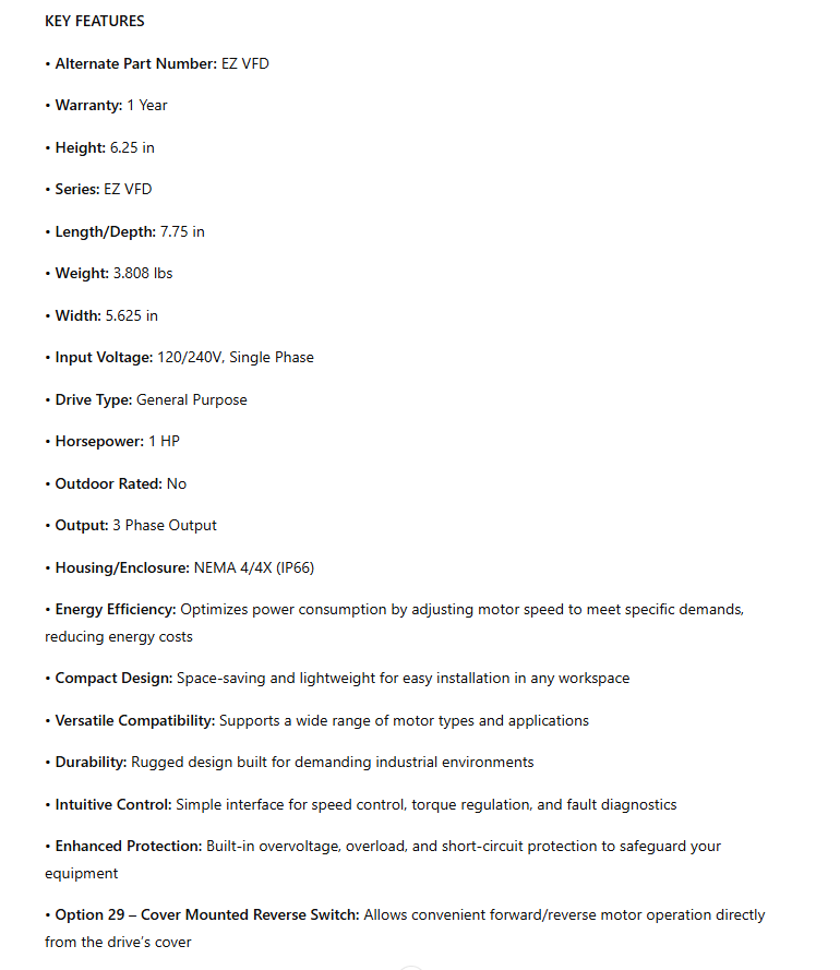 VF100E-29, EZ-VFD, 1/4 TO 1Hp, 110-240VAC (1PH) I/P ~ 230VAC (3PH) O/P, NEMA 4X with Fwd/Rev Switch