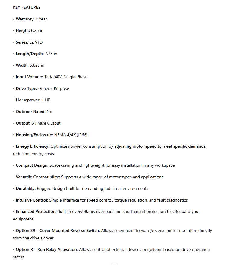 VF100E-R-29, EZ-VFD, 1/4 TO 1Hp, 110-240VAC (1PH) I/P ~ 230VAC (3PH) O/P, NEMA 4X with Run Relay Activation & Fwd/Rev Switch