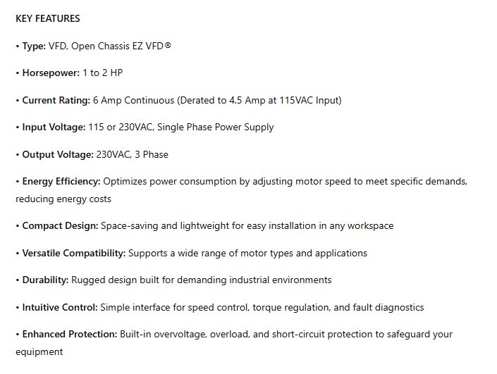 VF200C, EZ-VFD 1 to 2Hp, 115-230VAC (1PH) I/P ~ 230VAC (3PH) O/P, Open Chassis
