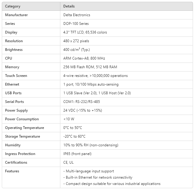 P-DOP-103WQ, Dop-100 Series Hmi 4.3 Touch Screen, High Resolution, With Ethernet Port