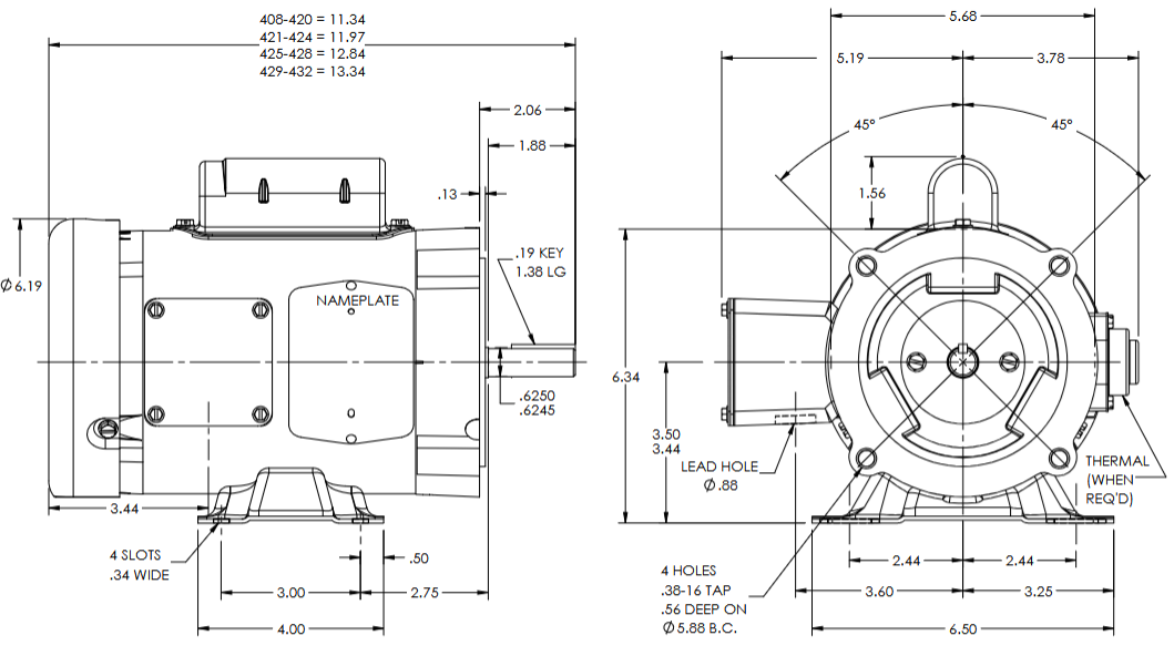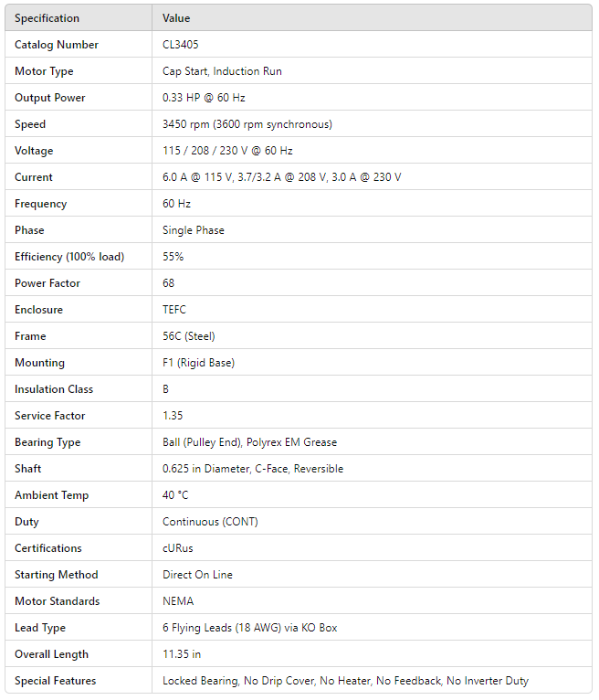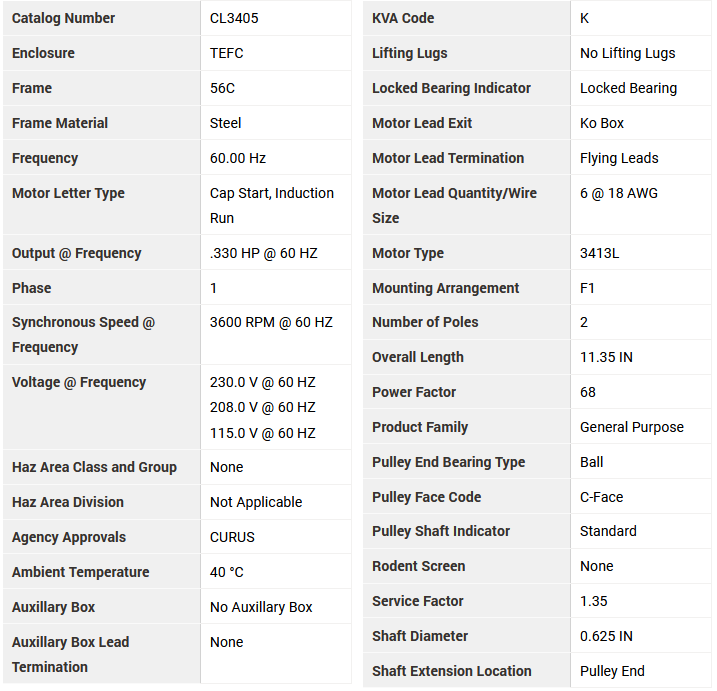 CL3405, Baldor .33Hp, 115/208-230V, 3450RPM, 1PH, 60HZ, 56C, 3413L, TEFC, F1