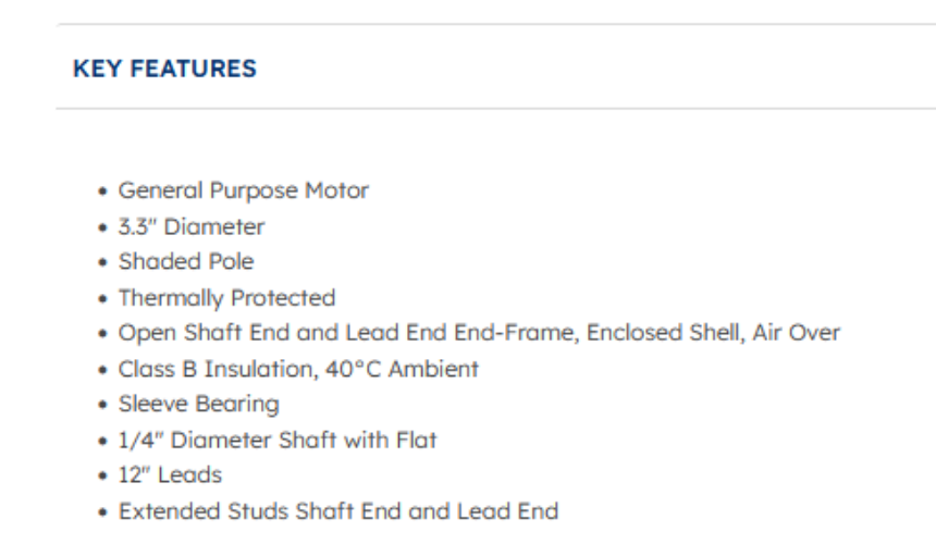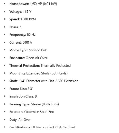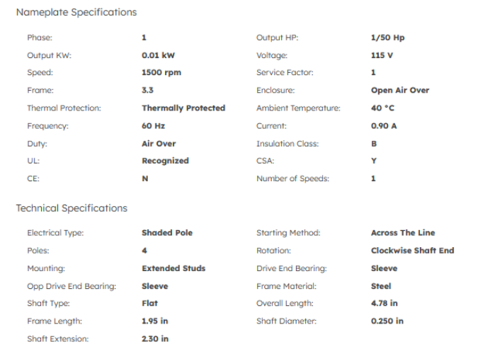 D603, Fan and Blower Motor, 1/50Hp, 1 Ph, 60 Hz, 115 V, 1500 RPM, 1 Speed, 3.3" Diameter, OAO