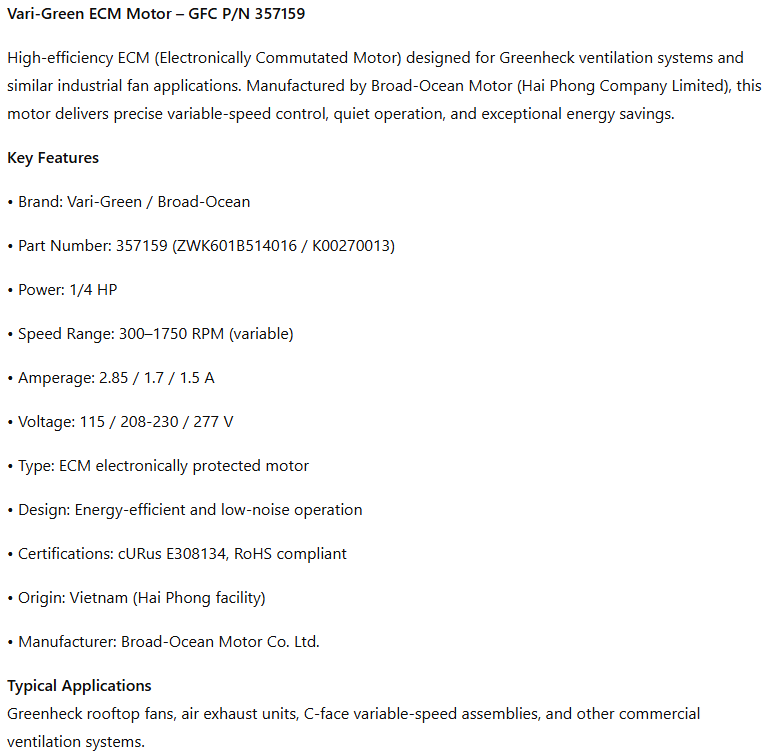 Vari-Green, ECM Motors,  GFC P/N 357159,