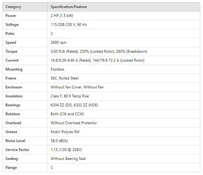 Torque 3.00 ft.lb (Rated), 250% (Locked Rotor), 280% (Breakdown)