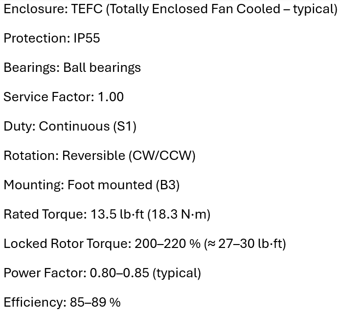 • Enclosure: TEFC (Totally Enclosed Fan Cooled – typical)