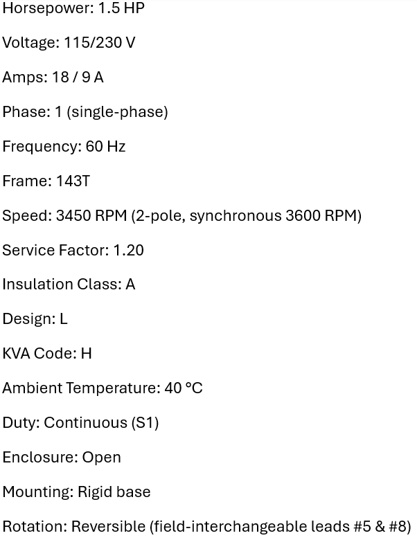 • Speed: 3450 RPM (2-pole, synchronous 3600 RPM)
