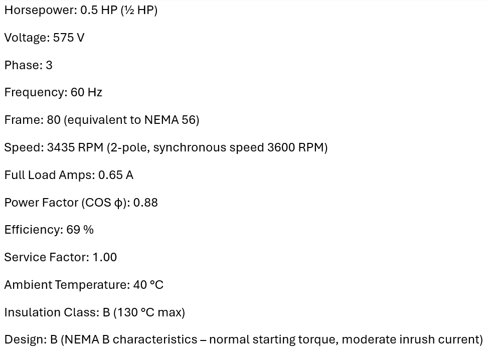 • Speed: 3435 RPM (2-pole, synchronous speed 3600 RPM)