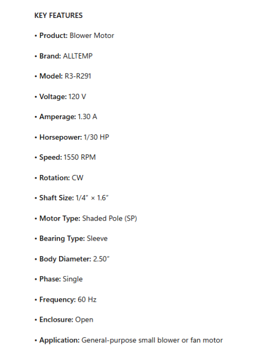 R3-R291, Blower Motor, 1/30Hp, 1550RPM, 120V, 60Hz, 1Ph, CW, Frame 48, Open Encl. is backordered and will ship as soon as it is back in stock.