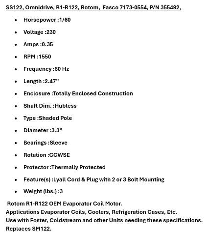 SS122, Omnidrive, R1-R122, Rotom,  Fasco 7173-0554, P/N 355492,