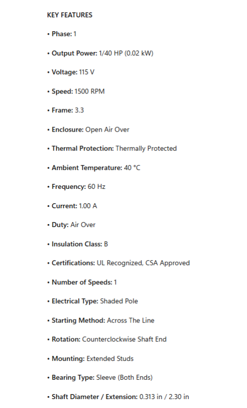D127, Fan and Blower Motor, 1/40Hp, 1 Ph, 60 Hz, 115 V, 1500 RPM, 1 Speed, 3.3" Diameter, OAO