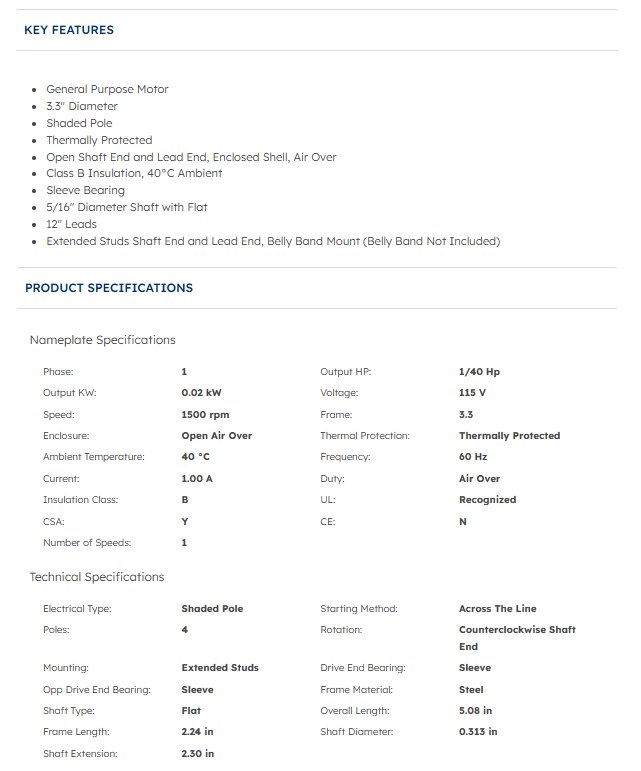 D127, Fan and Blower Motor, 1/40Hp, 1 Ph, 60 Hz, 115 V, 1500 RPM, 1 Speed, 3.3" Diameter, OAO is backordered and will ship as soon as it is back in stock.