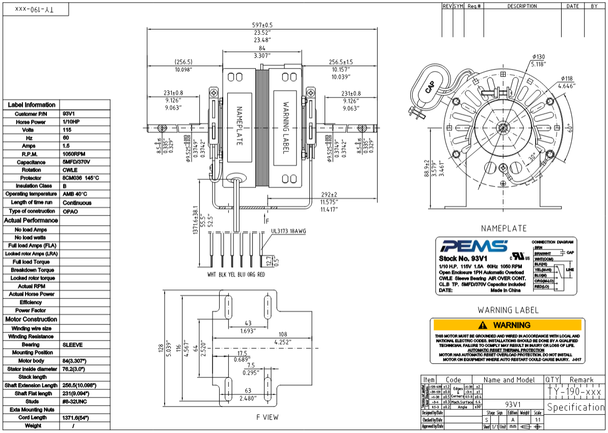 93V1, PEMS Fan Coil / Air Conditioner - PSC - 5" Dia - 1/10Hp - 1050 RPM - 115 V - Double Shaft