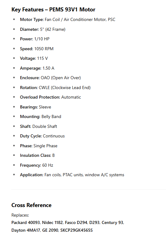 Packard 40093, Nidec 1182, Fasco D294, D293, Century 93,Dayton 4MA17, GE 2090, SKCP29GK4565S