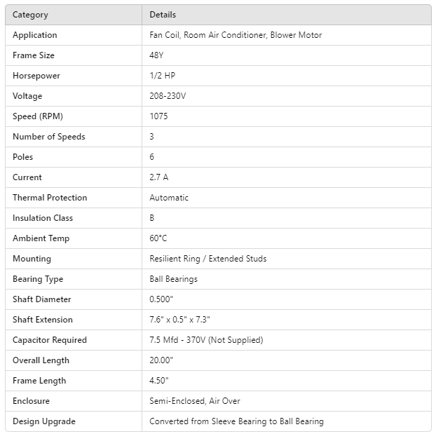 XRA1056, Xactone, Fan Coil & Air Conditioner Motor, 1/2 Hp, 1 Ph, 60 Hz, 208-230 V, 1075 RPM, 3 Speed, 48 Frame, SEMI ENCL - RA1056
