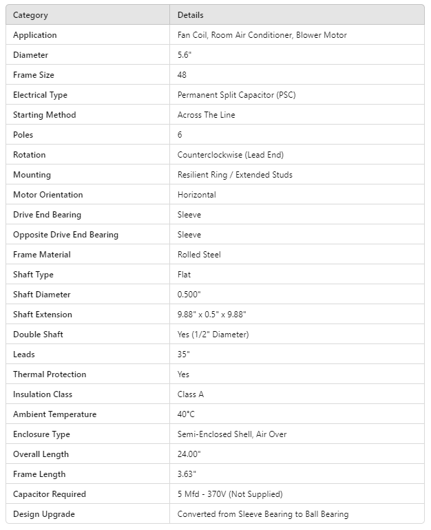 XRA1026, Xactone, Fan Coil & Air Conditioner Motor, 1/4 HP, 1 Ph, 60 Hz, 208-230 V, 1075 RPM, 3 Speed, 48 Frame, SEMI ENCLOSED