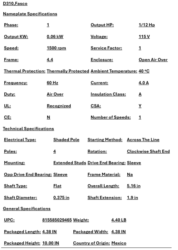 D410 FASCO, UFM410, 229-482/48, 1/10 HP, 3000 RPM, 115/230V, 1.4/0.7A REZNOR, RFM410, E96382