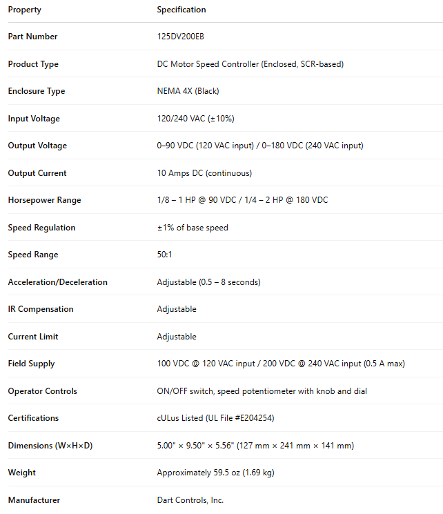 125DV200EB, 1/8-2Hp 120/240V(i/p) 90/180VDC (o/p) ON/OFF NEMA 4X Black is backordered and will ship as soon as it is back in stock.