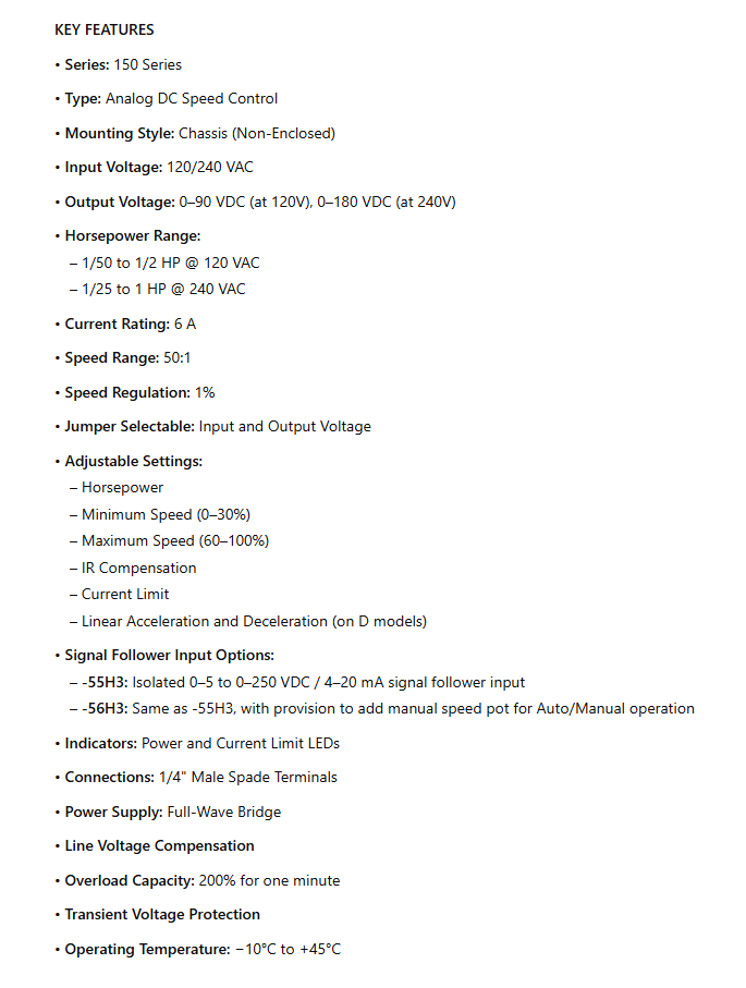 153D-200C-56H3, 150 Series Chassis Dc Drive 1/50-1/2Hp 120vac~90vdc / 1/25-1Hp 240vac~180vdc 6a Isolated 0-5 To 0-240vdc / 4.20ma Signal Follower W/Auto Manual
