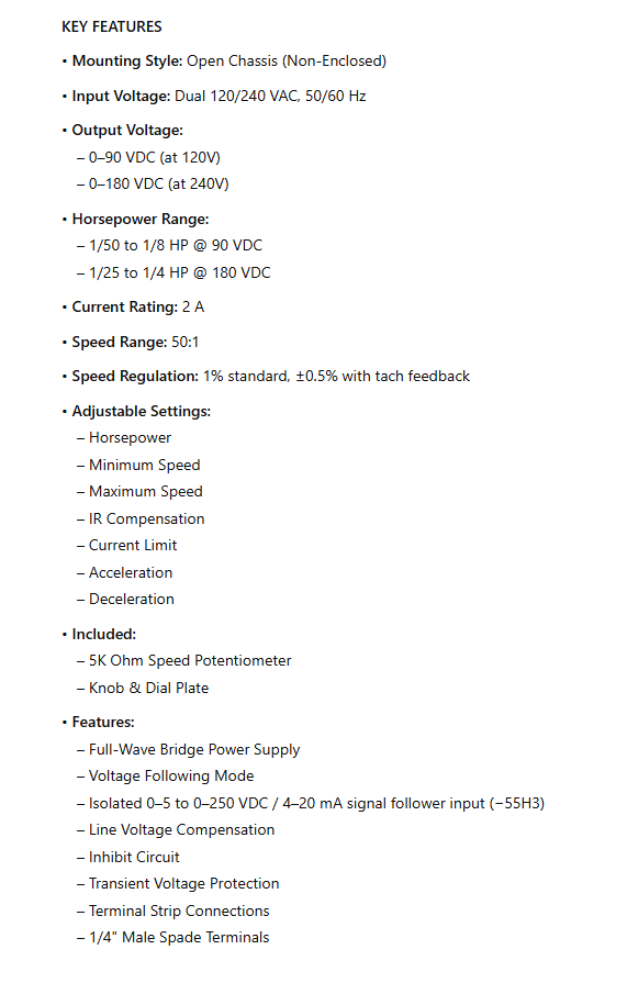 153D-25C-55H3, 150 Series Chassis Dc Drive 1/50-1/8Hp 120vac~90vdc / 1/25-1/4Hp 240vac~180vdc 2a Isolated 0-5 To 0-240vdc / 4.20ma Signal Follower
