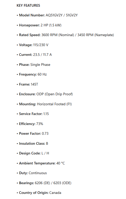 51GV2Y, 2Hp, 3450 RPM, 115/230V, 1Ph, 60Hz, Frame 145T, ODP, AQ51GV2Y is backordered and will ship as soon as it is back in stock.