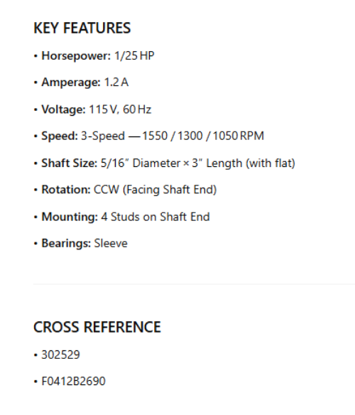302529M, OEM Replacement, 1/25Hp, 1550 / 1300 / 1050 RPM, 115V, CCWSE