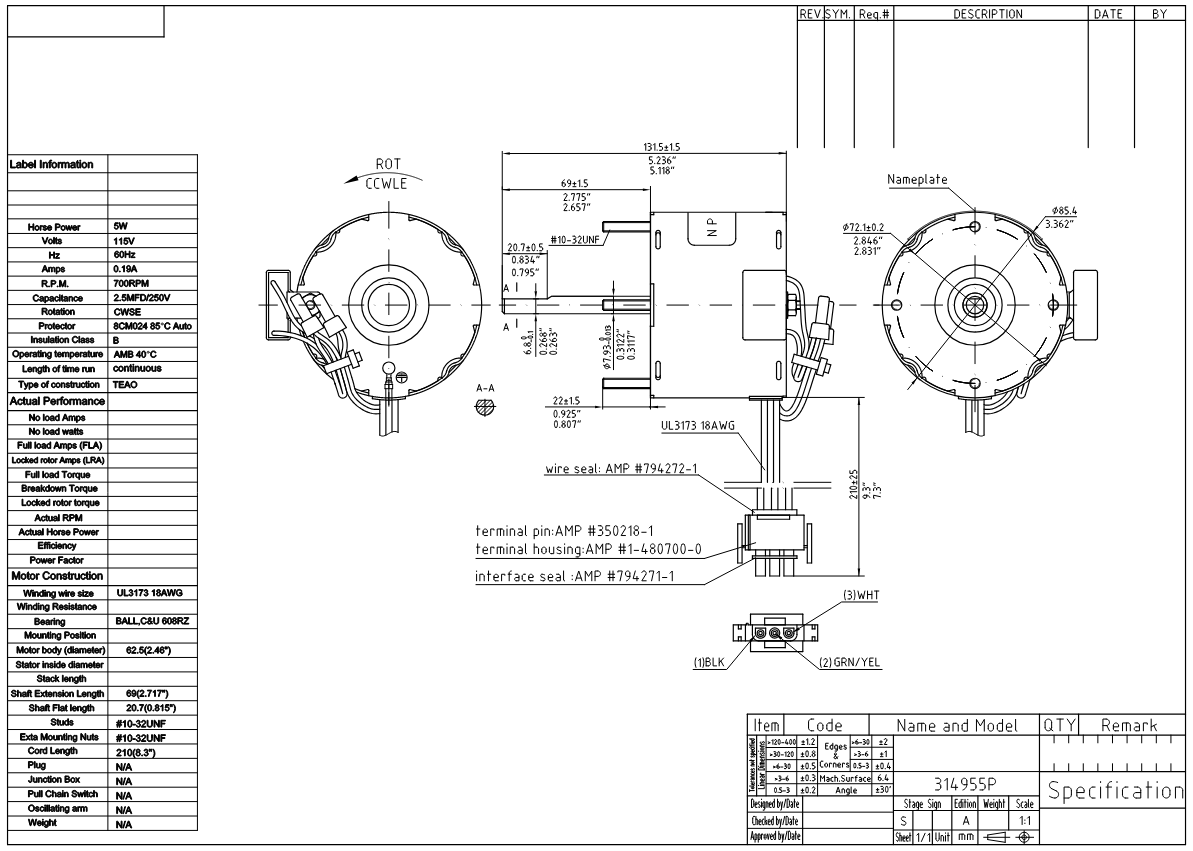 • Thermal Protector: 8CM024, 85°C Auto Reset
